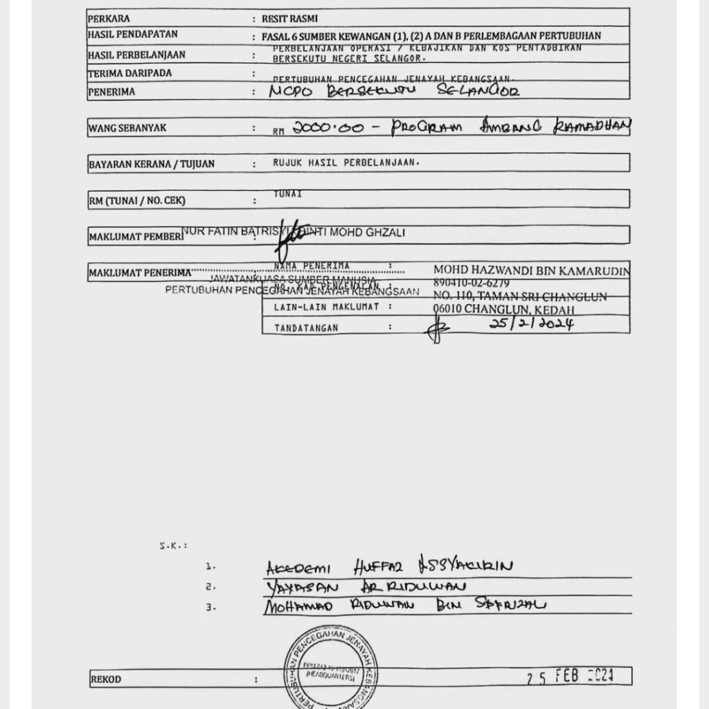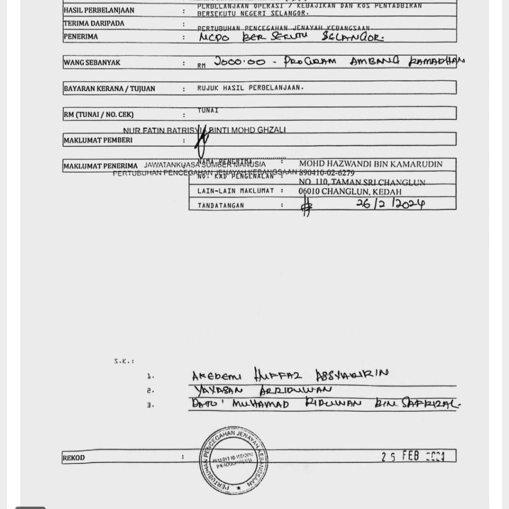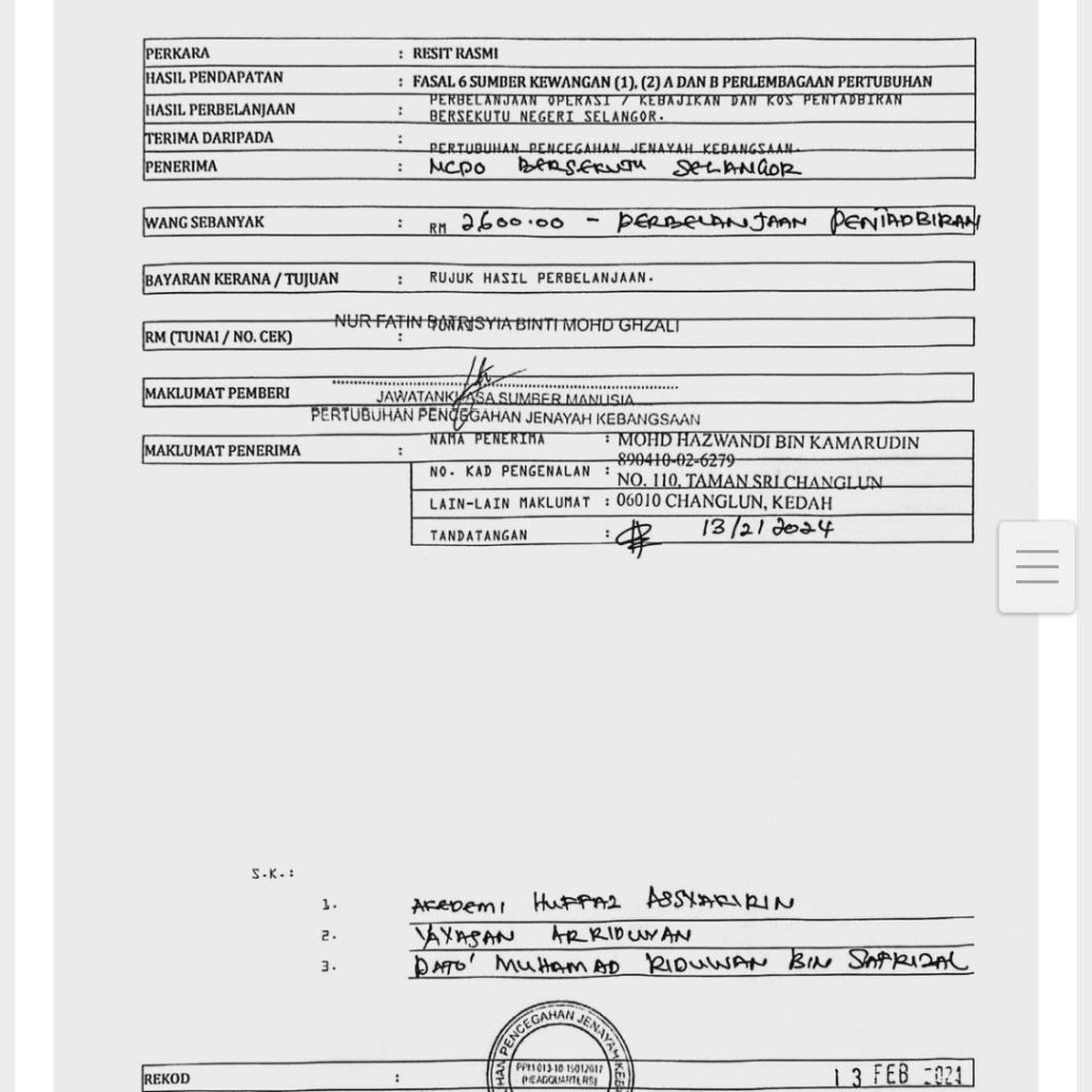 Mohd Hazwandi yang mengaku mewakili Pertubuhan Pencegahan Jenayah Kebangsaan Malaysia (NCPO ) yang dinaungi oleh Tan Sri Musa Hassan dan Tunku Muinuddin sebagai penasihat telah mengambil duit secara berperingkat Dari bendahari ncpo dari bulan September 2023, sehingga febuari 2024 (tetapi tidak diserahkan kepada yayasan Ar riduwan Dan akademi huffaz Assyakirin kononnya atas nama kerjasama. Namun, TIADA satu sen pun dikembalikan.