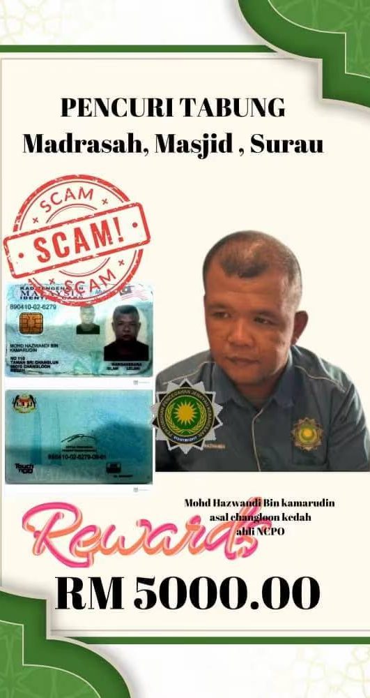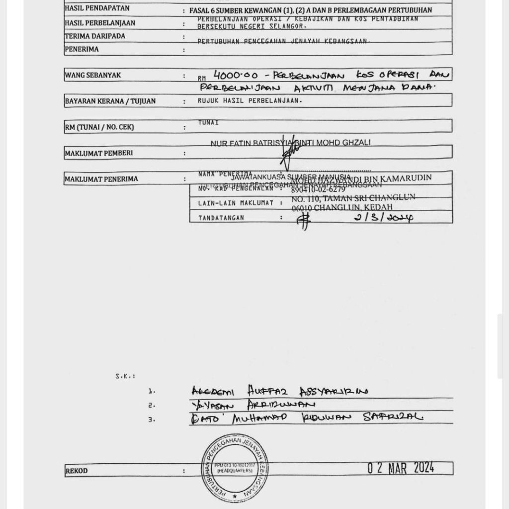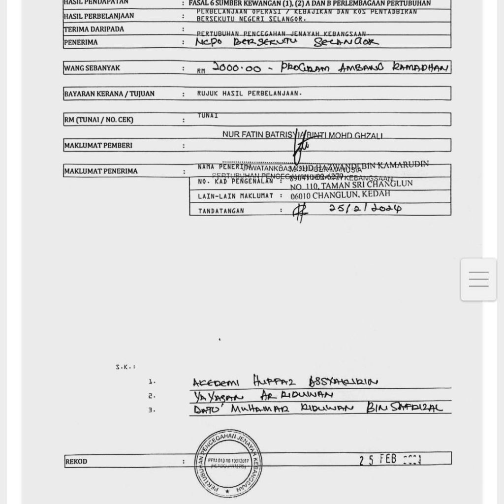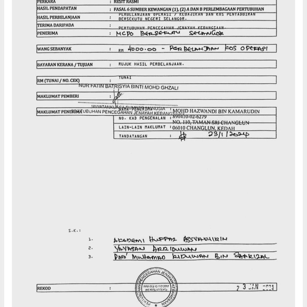Mohd Hazwandi yang mengaku mewakili Pertubuhan Pencegahan Jenayah Kebangsaan Malaysia (NCPO ) yang dinaungi oleh Tan Sri Musa Hassan dan Tunku Muinuddin sebagai penasihat telah mengambil duit secara berperingkat Dari bendahari ncpo dari bulan September 2023, sehingga febuari 2024 (tetapi tidak diserahkan kepada yayasan Ar riduwan Dan akademi huffaz Assyakirin kononnya atas nama kerjasama. Namun, TIADA satu sen pun dikembalikan.