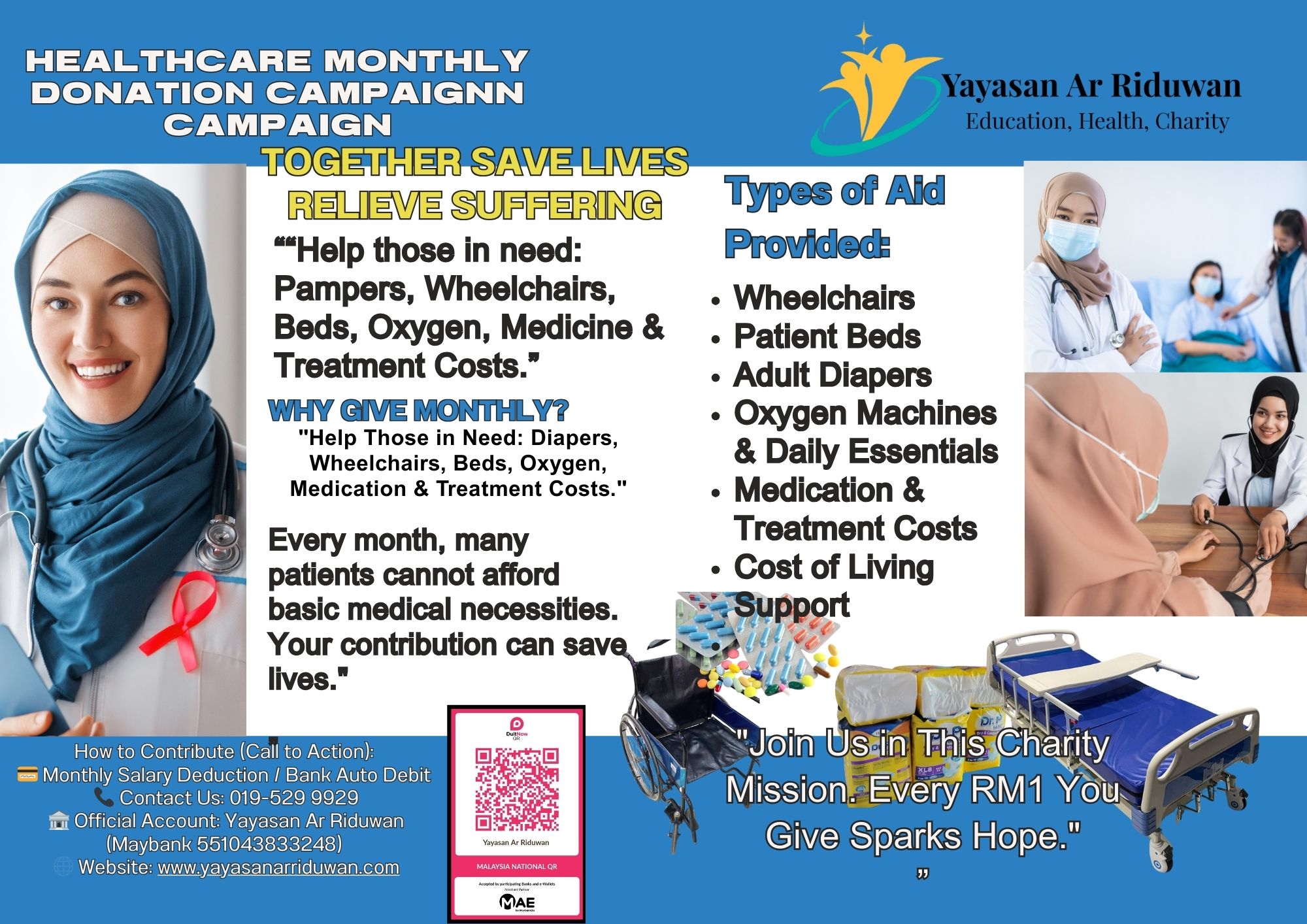 By contributing to the Yayasan Ar Riduwan Health Welfare Fund, you are directly supporting Malaysia’s national healthcare agenda — helping us build a compassionate safety net for the most vulnerable.