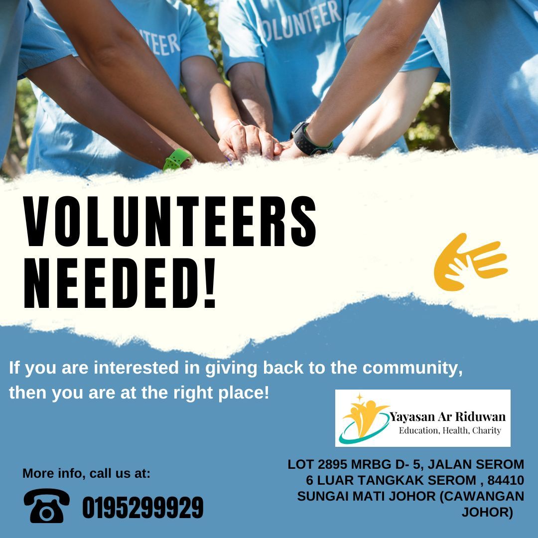 - Bersama Kita Membantu! Yayasan Ar Riduwan membuka peluang kepada individu yang berjiwa besar dan ingin berbakti kepada masyarakat. Dengan menjadi sukarelawan, anda bukan sahaja menyumbangkan tenaga, tetapi juga mencipta perubahan yang bermakna dalam kehidupan mereka yang memerlukan.